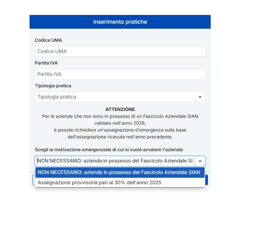 Per le aziende che non possono aggiornare in tempi brevi il piano colturale del Fascicolo aziendale SIAN per l’anno 2026, è possibile richiedere un’assegnazione d’emergenza sulla base dell’assegnazione ricevuta nell’anno precedente.